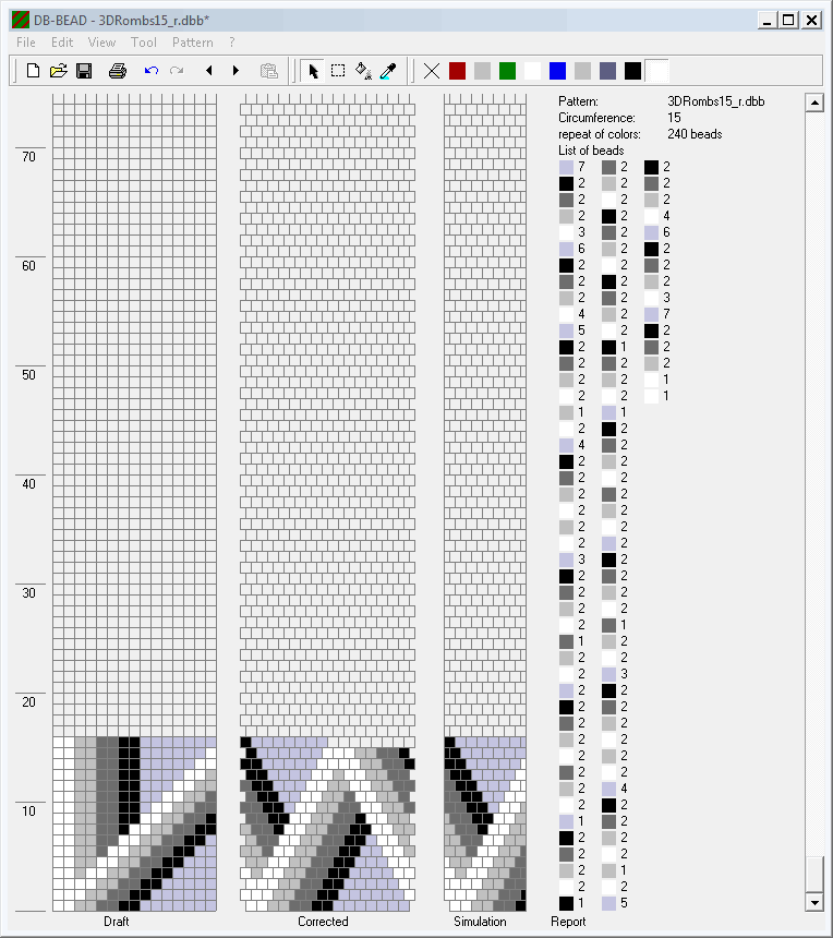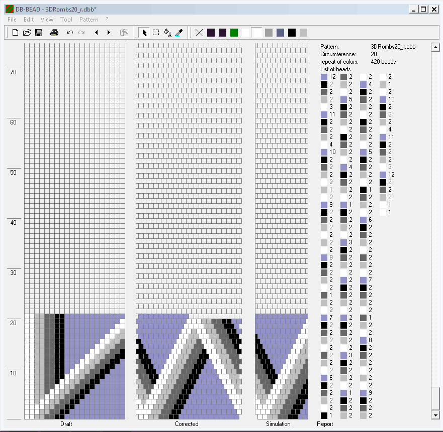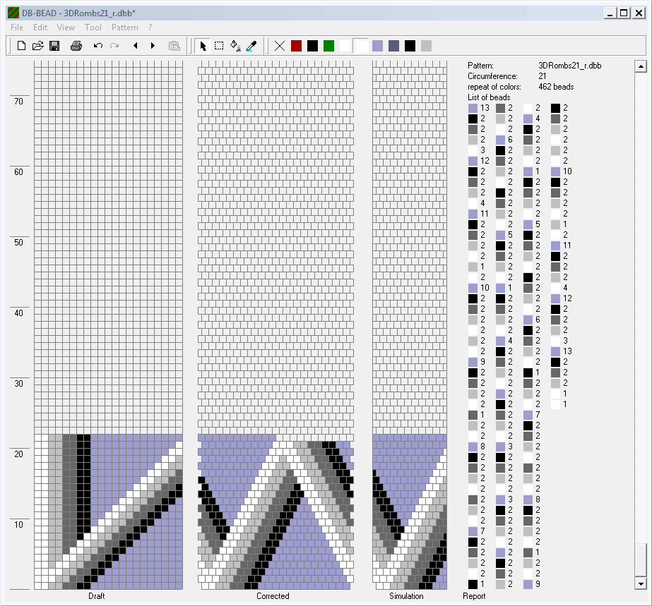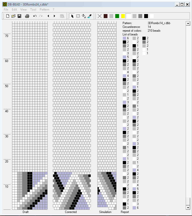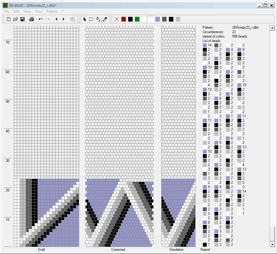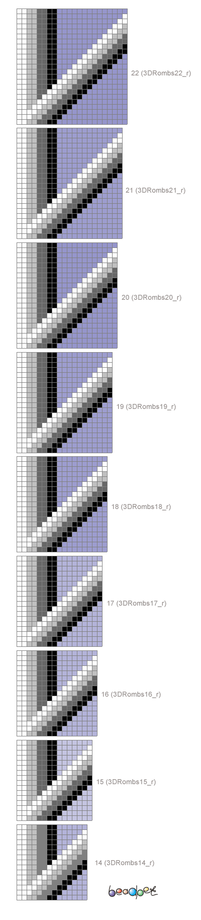 Schemes for the expanding (from 14 to 22 beads in a circle) beaded crochet rope "3D Rombs".